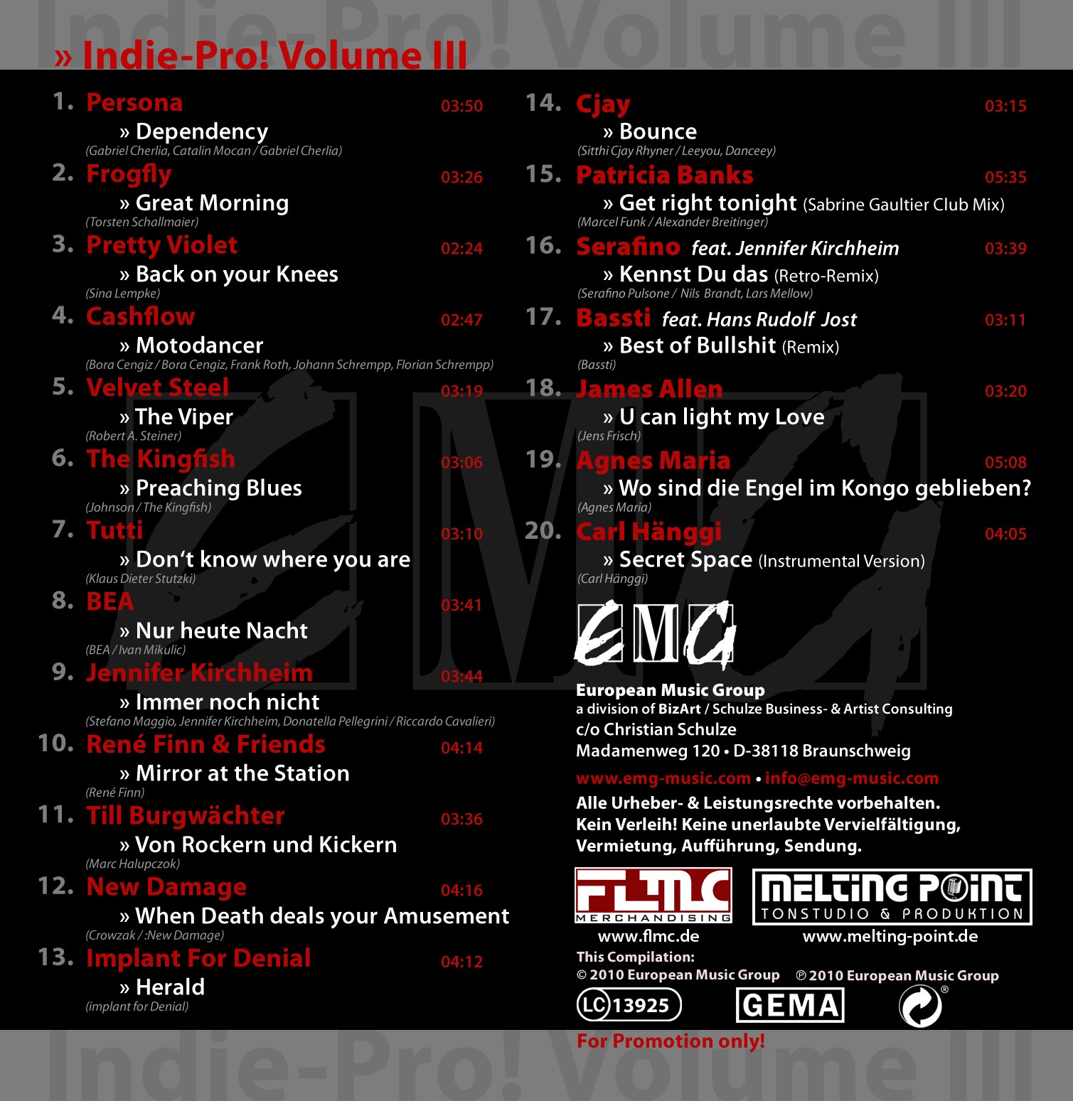 Wer sich also einen Überblick über die aktuelle Nachwuchs-Szene in Europa machen will, der wird um „Indie-Pro!“ Vol.3 nicht herumkommen. Die 20 Acts auf dieser CD sind ein unschlagbarer Beweis dafür, dass es an gutem Nachwuchs in Europa nicht fehlt – es bedarf nur größerer Anstrengungen, diese Vielfalt einem größeren Publikum darzustellen. EMG gelingt dies nun schon zum dritten Mal.